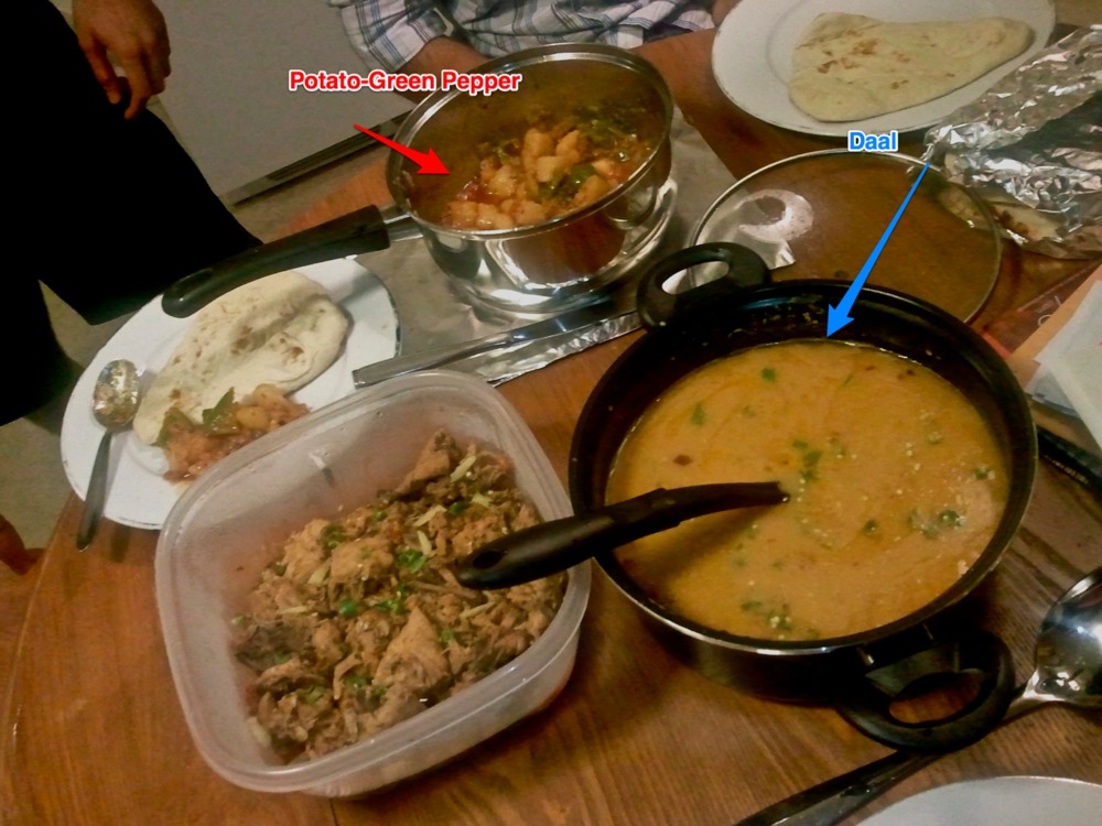 Good friend Sadaf was an awesome host yet again. What you see is a daal prepared quite differently as to back in North India. I am yet to figure out the finer details but it is Orange Masoor daal. The other dish is potatoes and green pepper prepared with spices, oil, onion and tomatoes. Great food once again.
