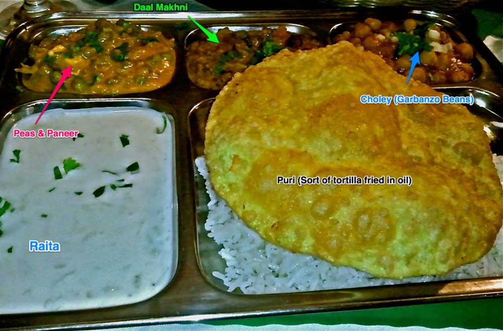 I ordered the Veg Thali that had 2 sabzis (Choley & Aloo Paneer), a daal (Daal Makhni), rice, a puri (pronounced poo-ree), raita (yogurt with some sliced vegetables & spices) and rice—$15. The other two friends ordered some non-vegetarian dishes. We all enjoyed the food and it continues to make us believe that buffet food is not as good as the freshly(?) prepared, ala carte meals. It’s been true for all Indian restaurants in Syracuse so far.