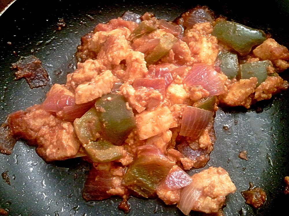 Oil, jeera, ginger garlic paste, tomato paste, Italian tomato sauce, onions, and cottage cheese/paneer… In addition to salt, pepper, red chili powder, and some Indian spices this turned out to be just about perfect.