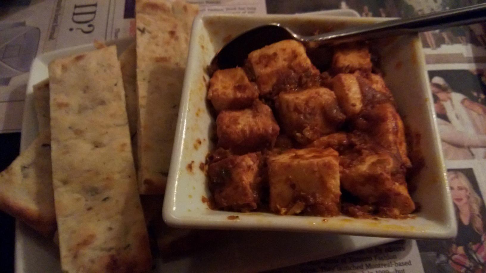 At a tiny place hidden between shops & restaurants is a fusion Indian place. Pictured here is the paneer dipped and prepared in a green/raw mango sauce and served with pita bread. It was different, tasted good and felt Indian.