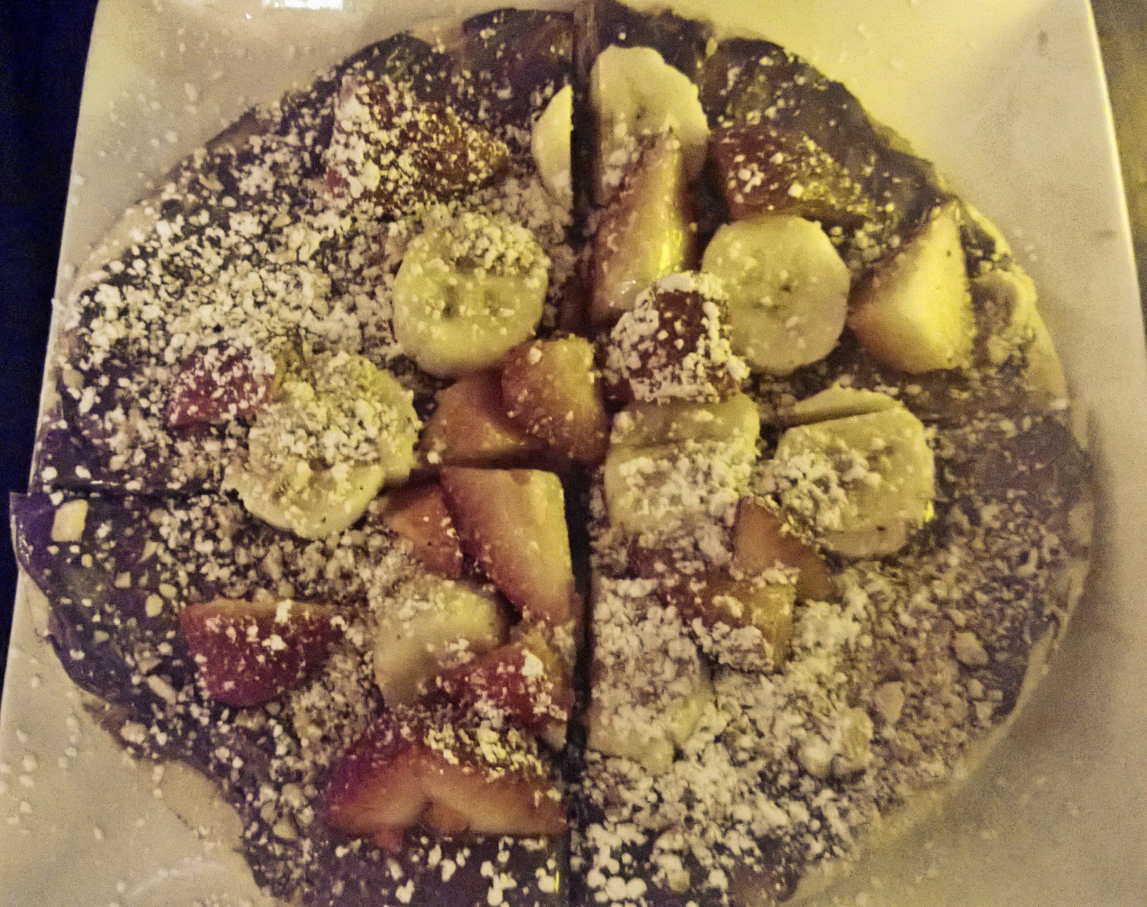 Chocolate Pizza topped with fresh fruits Posted by manan on April 20, 2013April 20, 2013 My main course at the chocolate and wine bar was a chocolate pizza that had bananas and strawberries sprinkled with sugar. Restaurant: Ayza Wine & Chocolate Bar Share this: Click to share on Facebook (Opens in new window) Facebook Click to share on X (Opens in new window) X Click to share on Pinterest (Opens in new window) Pinterest Click to email a link to a friend (Opens in new window) Email Click to share on WhatsApp (Opens in new window) WhatsApp Like Loading... Related