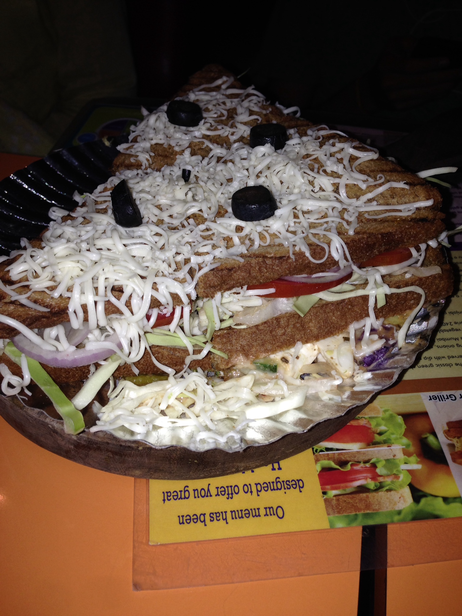 At a small juice and snack chain called Pishu’s, their Big Grilled sandwich comes with sautéed cottage cheese, lettuce, tomatoes, onions, green pepper, cheese in 2 layers of sandwich which is then grilled. Yes, the whole thing is grilled. The whole thing Is then topped with more cheese and olives.