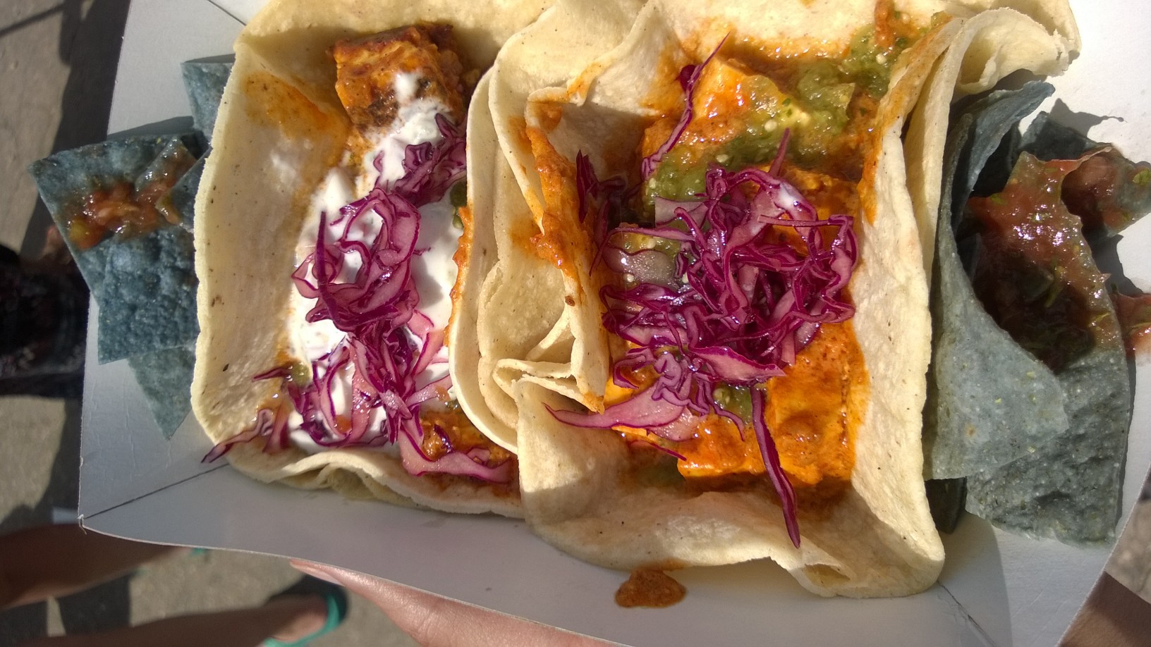 Discovered at smorgasbor in Brooklyn, the concept sounded great, and for some reason I wanted to try these in a hard shell taco. Unfortunately these were only available in soft shell. Not holding anything against the folks who went ahead with the idea, these tacos were no different than a Kati roll (more delicious though courtesy the yogurt).