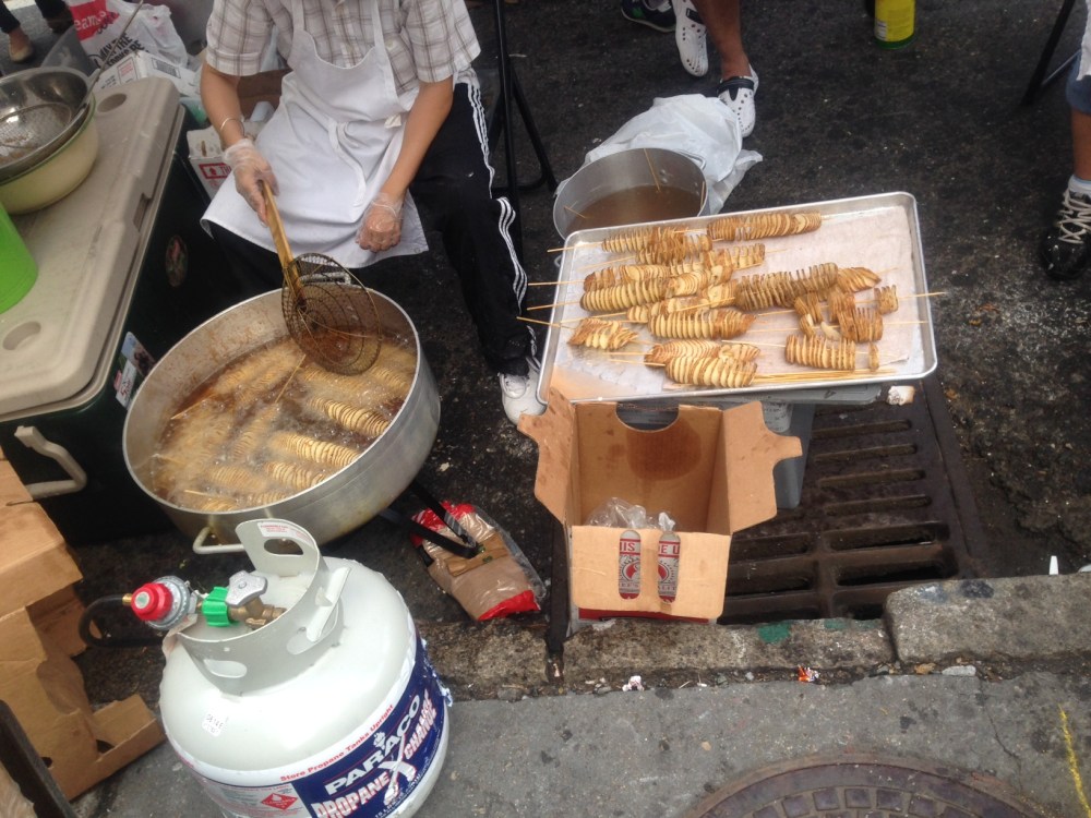 At a street fair in New York, my friend found these simple potato-fries-on-a-skewer. These are made fresh to order, very thinly sliced potatoes through some ingenious contraption that cuts an entire potato into a continuous Lays shape.