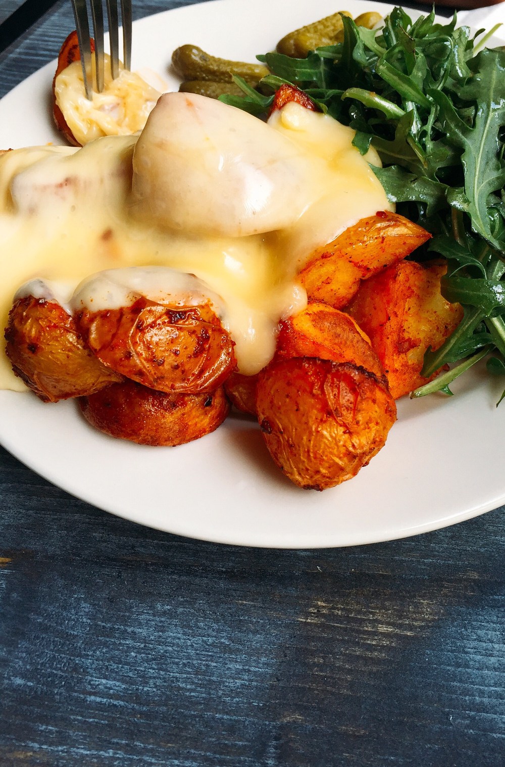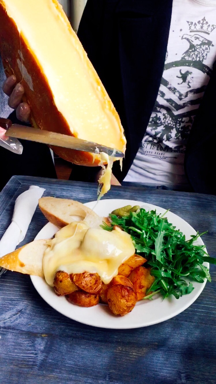 Not knowing what to expect we end up at small little place with a as many tables as they could fit in, and scrolling through the menu I get excited. They have more vegetarian options than I anticipated! While we waited for our orders to come, I see the server walking to a table with half a cheese wheel, sliding a knife through it and gooey, liquid cheese falling from this half-wheel on a plate of roasted potatoes. My eyes lit up! That yellow melting cheese smoothly falling off the wheel had me lusting. And then came our plate. Here’s what happened: