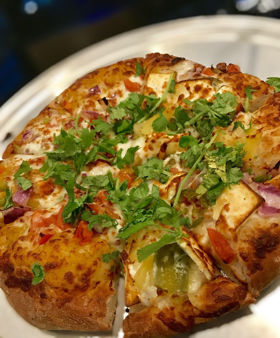 Pav bhaji pizza on the left half with paneer/pineapples pizza on the right half