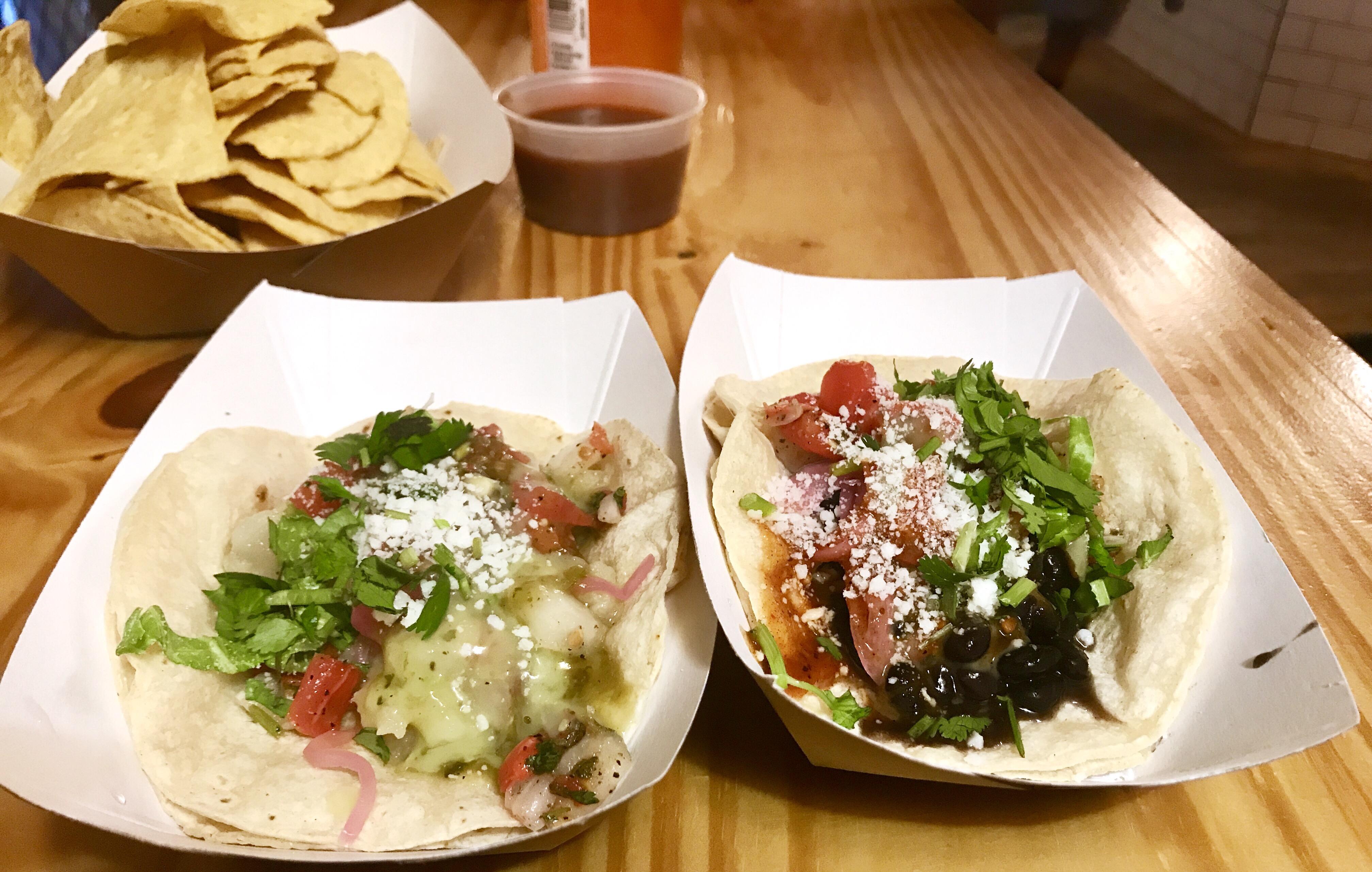 At Oaxaca Taqueria, they seem to understand that vegetarian is more than mushrooms. And their poblano peppers with pickled onions bring flavors to the tacos. 2 types of vegetarian tacos that are simple but enhanced with spice and tang.