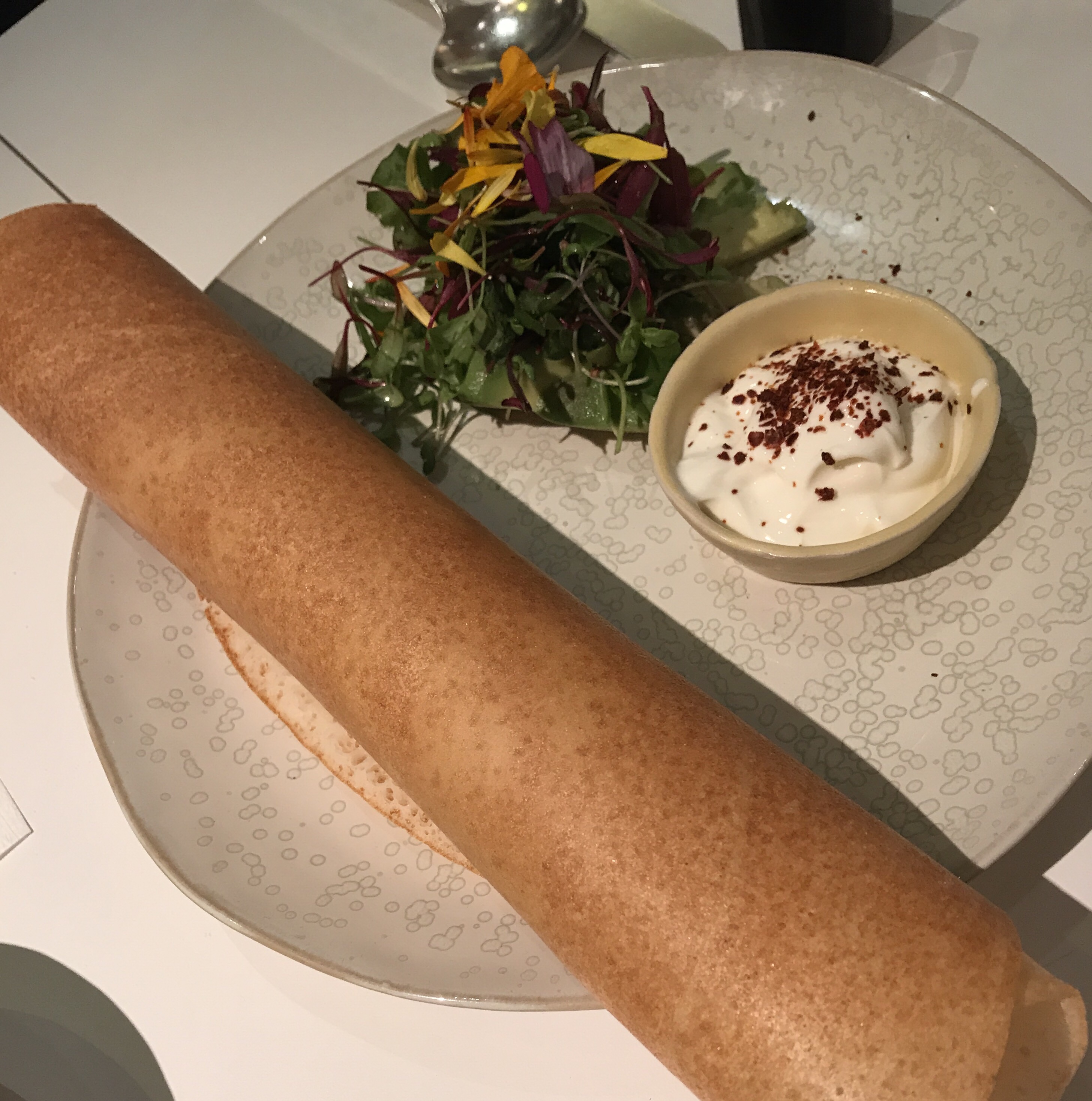 The dosa was spot on. The texture and flavors were as good as at a South Indian restaurant. I had never had dosa with a yogurt sauce till at abcv, and it was amazing. The salad added some needed flair.