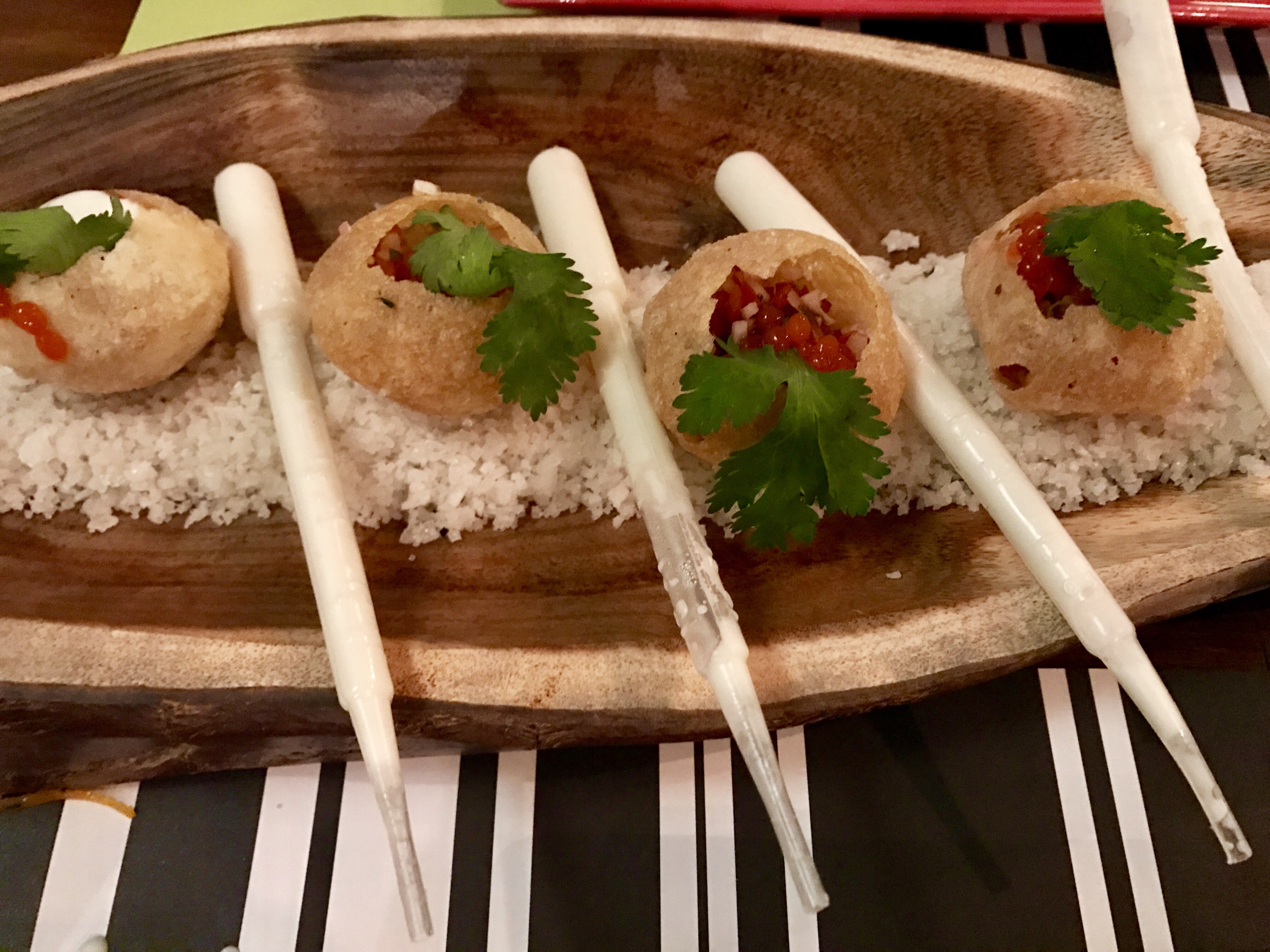 5. Mozzarella Cheese Shells: puri with chilli tomato caviar and mozzarella fondue
