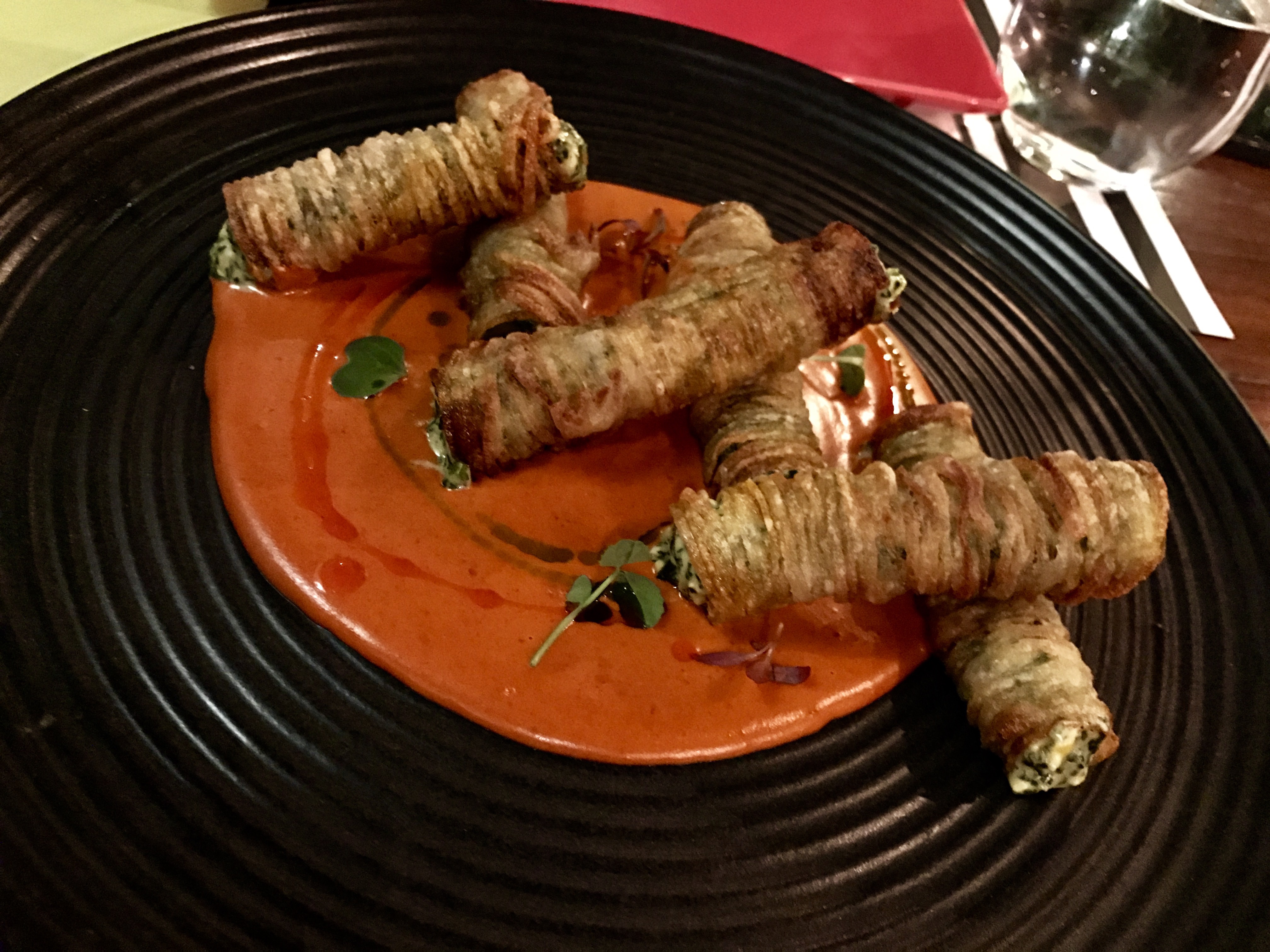3. Tuffler Potatoes: Potato spaghetti cylinder stuffed with spinach and corn (surprisingly good!)