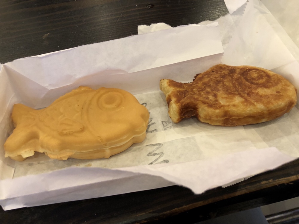 Custard or nutella filled fish shaped cooked batter. These were super disappointing because the ratio of batter to filling was way off.