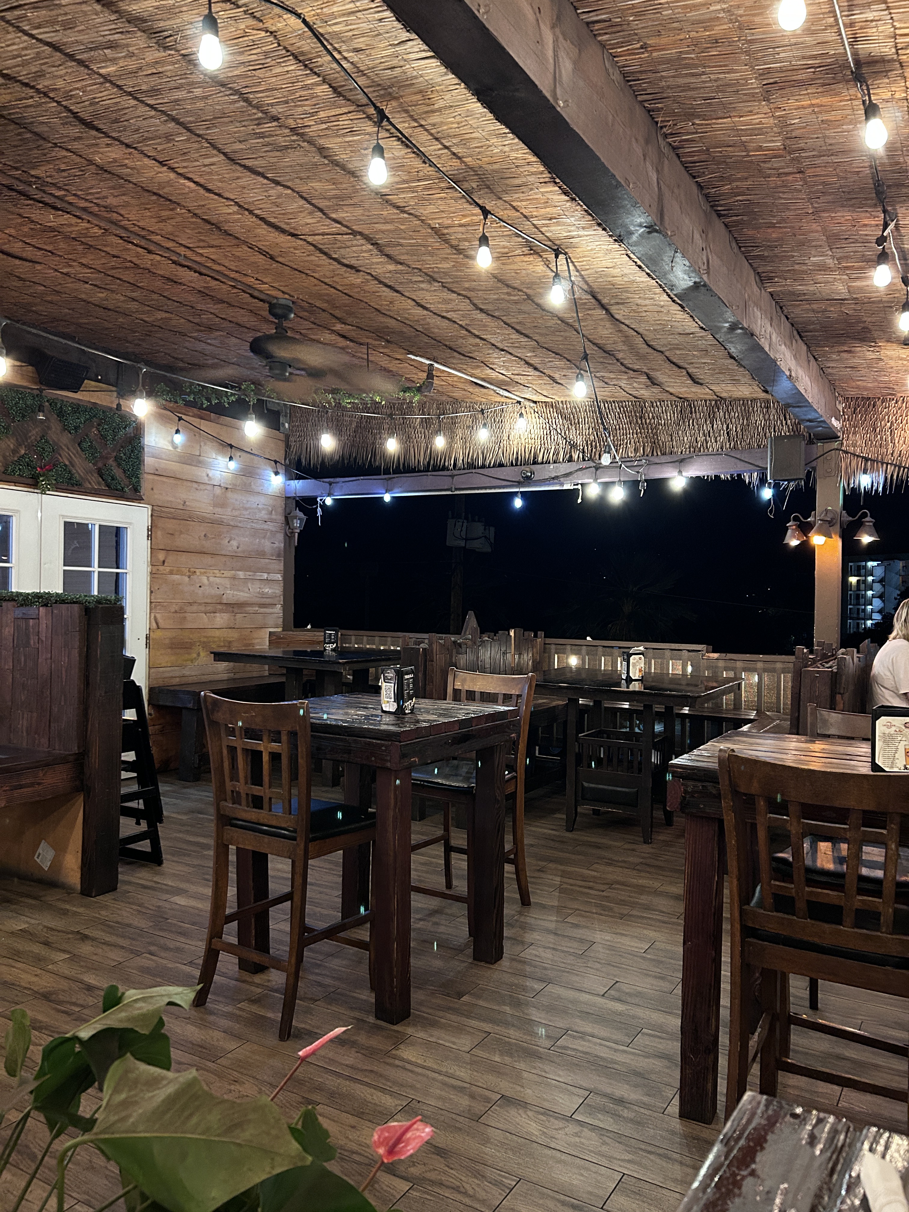 We drove to the restaurant we wanted to go to, but it was closed for a private event. Then we ended up at this restaurant. The Lava Rock Bar & Grill is a fun spot. They were extremely accommodating a fussy vegetarian. Some fries, mango salsa & chips, Neyon Sausage with steamed veggies and rice, vegetarian tacos.
